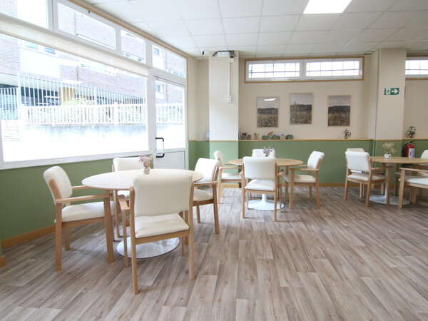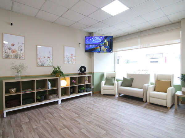 La sala polivalente del Centro de día Magallanes, es la zona más amplia del local. Un área con infinitas posibilidades y con distintos espacios, según los usos planificados para cada uno. Por ejemplo, aquí se encuentra la zona de descanso, el comedor, el área de juegos, los casilleros, una zona de ejercicio, el espacio de televisión, etc. La sala es muy luminosa, llena de vida, gracias a los amplios ventanales ubicados tanto en la fachada del local, como en la zona trasera del mismo.